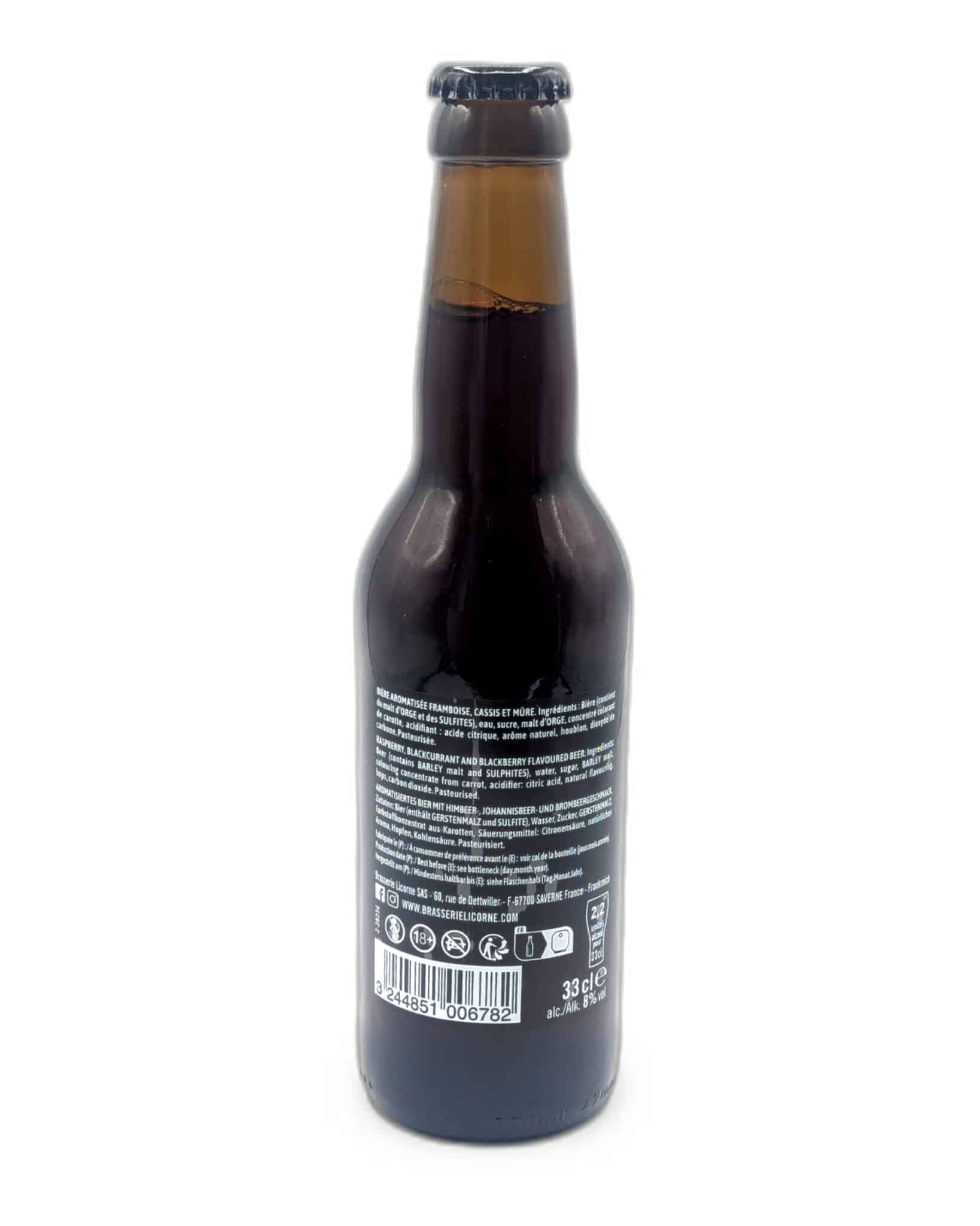 La Slash Berry de la brasserie Licorne est une bière fruitée qui se distingue par sa robe rouge intense et son profil aromatique gourmand, articulé autour de la framboise, du cassis et de la mûre.