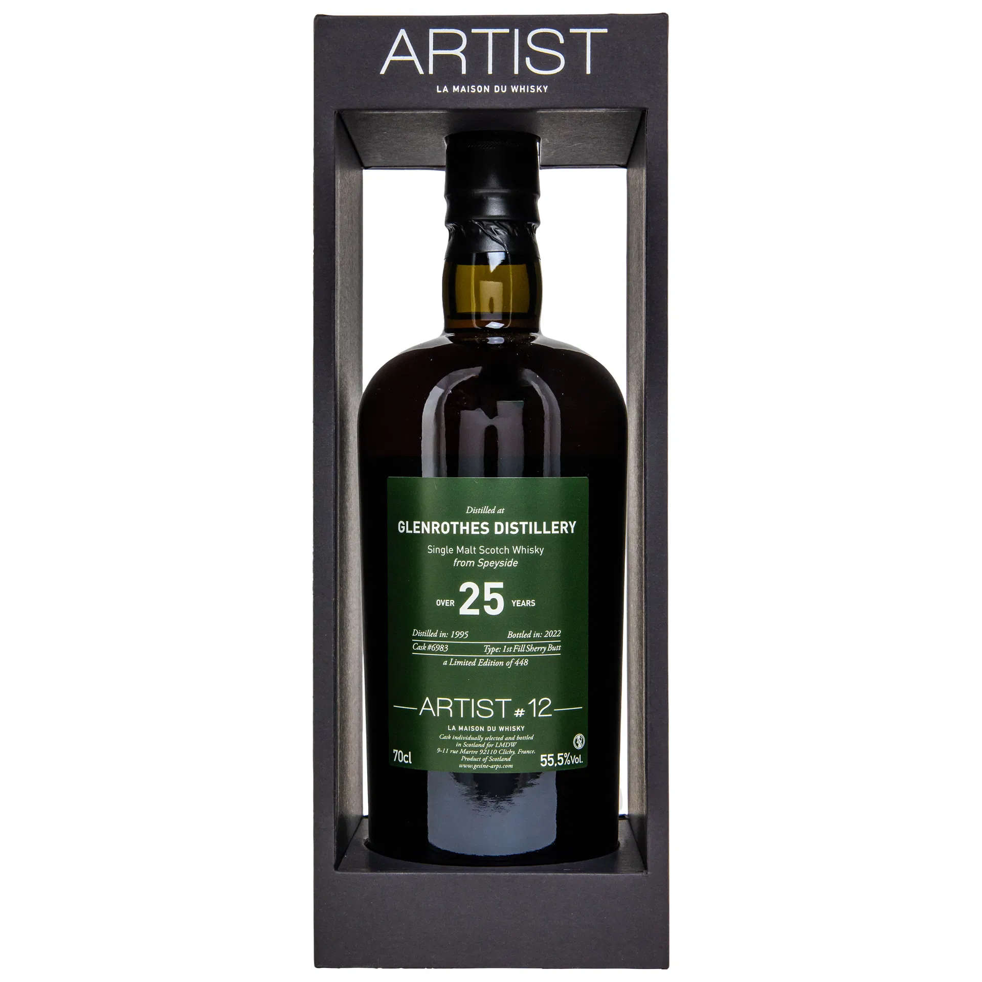 Distillé en 1995 chez Glenrothes (Rothes, Speyside), élevé plus de 25 ans en fûts de chêne à dominante sherry pour la série Artist #12 – Over 25. Édition limitée, soigneusement sélectionnée et embouteillée au format 70 cl. La longue maturation confère la signature de Glenrothes : fruité confit, texture cireuse et équilibre entre douceur maltée et chêne noble — un whisky de collection taillé pour les amateurs de Speyside millésimé.